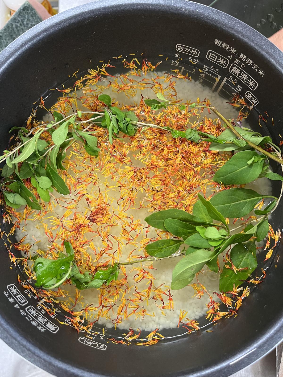 いつもの炊飯にベニバナを少したすとベニバナ色のご飯を楽しめますよ!